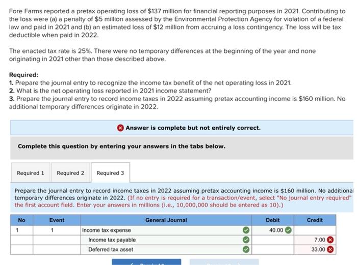 Solved Why I Get It Wrong Fore Farms Reported A Pretax Operating Loss Of Course Hero